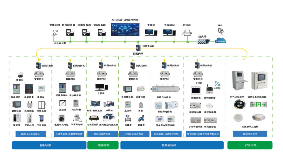 AcrelEMS-EDU校园智慧能源管理平台[2]集综合能源管理、公共用能管理、能源漏损监控、水电收费管理、宿舍用能管理、设备运维管理、变配电监控、智能照明、空调监控、电气消防安全等功能于一体,为高校智慧能源管理系统搭建提供完整的软硬件方案服务。